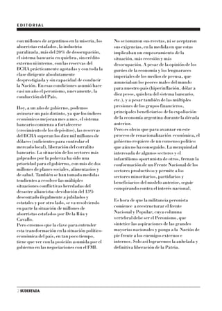 El documento analiza la situación política y económica en Argentina luego del colapso del gobierno de la Alianza. Argumenta que el gobierno de Duhalde está recuperando la decisión nacional al resistir las presiones de aceptar las recetas del FMI que empeorarían la recesión. Por otro lado, el discurso de Menem propone continuar el modelo neoliberal alineado con Estados Unidos. El debate interno en el peronismo es sobre qué modelo de país construir y con qué alianzas sociales e internacionales.