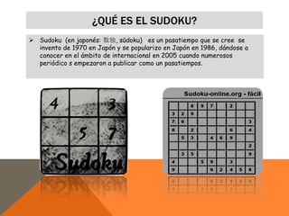 El Sudoku es un pasatiempo lógico que consiste en rellenar una cuadrícula de 9x9 dividida en subcuadrículas de 3x3 con los números del 1 al 9 sin repetir filas, columnas o regiones. Existen varios tipos de Sudoku como el 4x4, 6x6, 9x9 circular o con forma de estrella y el objetivo es eliminar o no repetir los números en cada sección.