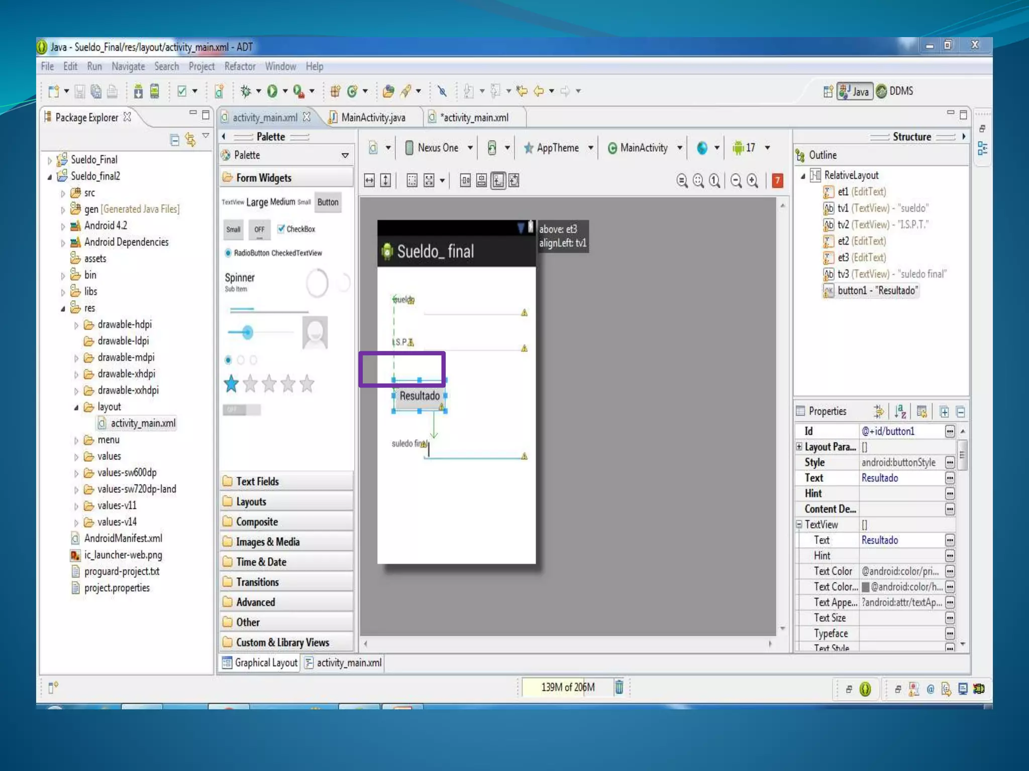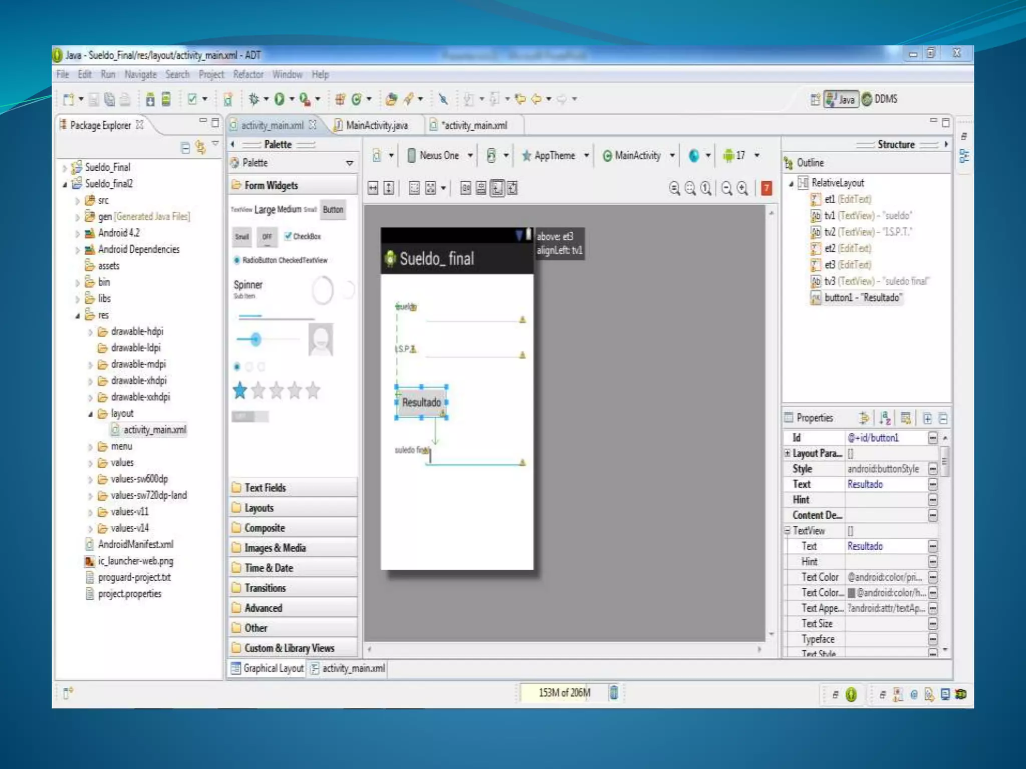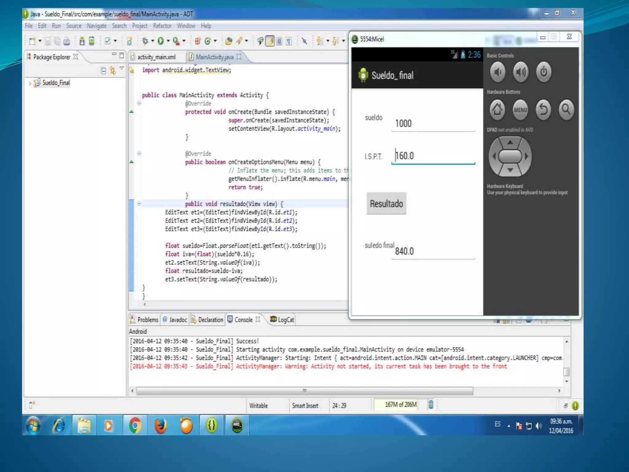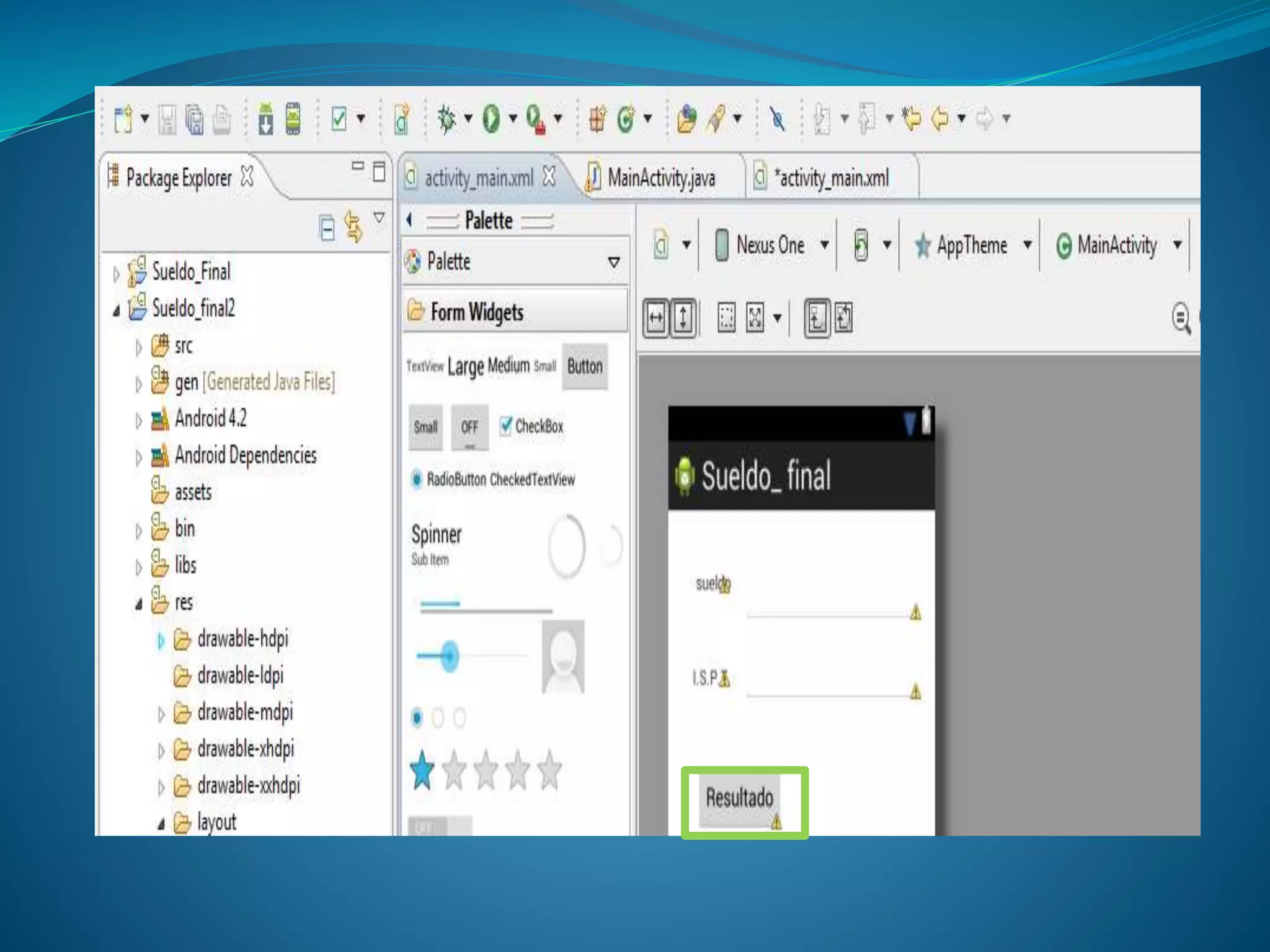 El documento describe los pasos para crear una aplicación móvil en Android para calcular el sueldo final de un empleado. Primero se crea un proyecto de aplicación Android y se le da el nombre "SUELDO_FINAL". Luego se agregan cajas de texto a través de la opción "Form Widget" para ingresar el sueldo, mostrar el IVA y mostrar el sueldo final. Finalmente, se incluye el código para calcular el IVA del sueldo, mostrarlo en la segunda caja de texto y mostrar el sueldo final en la tercera caja de