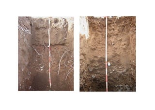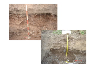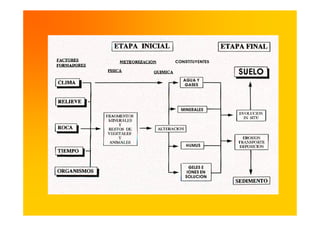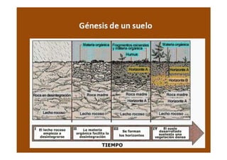 El documento describe los factores y procesos de formación de los suelos. Los principales factores incluyen el clima, la roca parental, la topografía, los organismos y el tiempo. La meteorización y la pedogénesis transforman la roca en suelo a través de procesos físicos, químicos y biológicos que ocurren a lo largo de períodos prolongados. Las propiedades del suelo como la textura, estructura, color y reacción dependen de estos factores y procesos.
