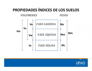 El documento presenta las propiedades, índices y relaciones fundamentales de los suelos, incluyendo volúmenes, pesos, peso específico, porosidad, grado de saturación, humedad, densidad relativa y más. Define cada término y presenta fórmulas para calcular valores como peso específico húmedo, seco y saturado usando datos como peso de la muestra, volumen de sólidos, agua y vacíos. Incluye tres ejercicios de aplicación de las fórmulas.