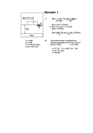 El documento presenta información sobre permeabilidad, consolidación y expansión de suelos. Resume los conceptos clave de cada tema en 4 títulos. El Título I define permeabilidad y los factores que la afectan. El Título II describe métodos para medir el coeficiente de permeabilidad. El Título III explica la velocidad de consolidación y grado de consolidación. Finalmente, el Título IV detalla los tipos de expansión que pueden ocurrir en suelos arcillosos.