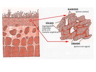 El documento describe la importancia del suelo y sus funciones. El suelo es un material que cubre la superficie terrestre y ha adquirido propiedades a través de la interacción de sus componentes inorgánicos, orgánicos, espacios vacíos y organismos vivos. El suelo cumple funciones esenciales como soporte físico y almacenamiento de nutrientes y agua para las plantas, así como hábitat para organismos. El suelo es un recurso no renovable y esencial para el crecimiento de las plantas y la