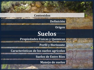 Este documento describe los conceptos básicos de los sistemas agroproductivos, incluyendo la definición, origen y composición de los suelos, las propiedades físicas y químicas de los suelos, el perfil y los horizontes del suelo, las características de los suelos agrícolas y los suelos de Entre Ríos, y el manejo de los suelos.