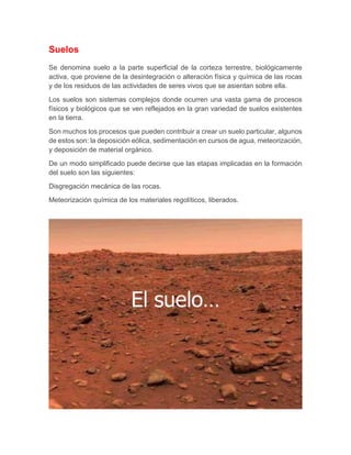 El documento describe los diferentes tipos de suelos, clasificados según su funcionalidad y características físicas. Entre los suelos descritos según su funcionalidad se encuentran los arenosos, calizos, humíferos, arcillosos, pedregosos y mixtos. Los suelos se clasifican físicamente en litosoles, cambisoles, luvisoles, acrisoles, gleysoles, fluvisoles, rendzinas y vertisoles.