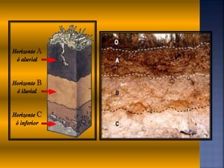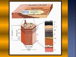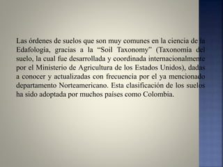 Este documento describe los 12 órdenes de suelos según la clasificación de la Soil Taxonomy estadounidense, incluyendo sus características. Explica que los suelos se clasifican de acuerdo a sus propiedades y desarrollo. También habla brevemente sobre los perfiles de suelo y sus horizontes principales (A, B, C), señalando que la estructura puede variar dependiendo del tipo de suelo.