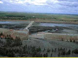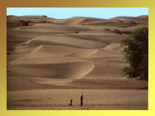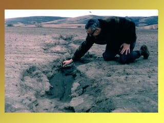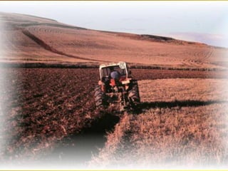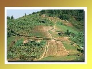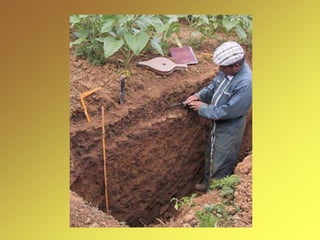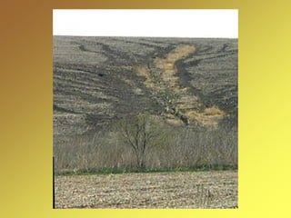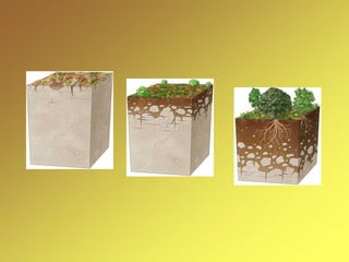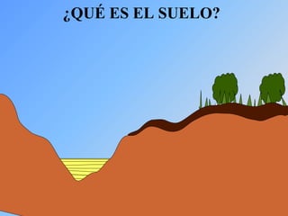 El suelo es la capa superficial de material suelto que se forma por la meteorización de la roca y la acción de los seres vivos. Está compuesto principalmente de aire, agua, materia orgánica e inorgánica. Se forma lentamente a lo largo de miles de años y provee nutrientes esenciales para las plantas y microorganismos. Sin embargo, los suelos se encuentran en peligro debido a la contaminación, salinización, erosión y pérdida de suelo, lo que afecta negativamente la escorrentía y la product