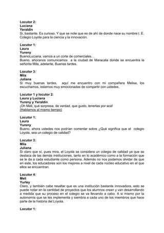 Este documento presenta un programa de radio sobre el Colegio Loyola para la Ciencia y la Innovación en Medellín. A través de entrevistas con estudiantes y directivos, el programa describe cómo el colegio fomenta el aprendizaje basado en proyectos, el trabajo colaborativo y el uso de las TIC para la enseñanza de ciencia y tecnología. Además, destaca que el colegio se distingue por su alta calidad académica y por formar estudiantes íntegros e innovadores.