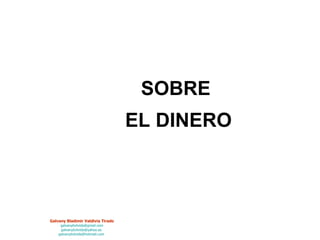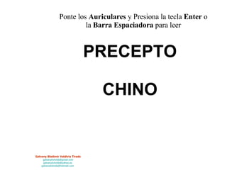El documento presenta un precepto chino sobre el dinero y sus limitaciones. Afirma que el dinero puede comprar cosas materiales pero no conceptos abstractos como un hogar, tiempo, sueños, conocimiento, salud, respeto, vida o amor. Luego relata algunas historias de personas que supuestamente tuvieron buena suerte después de recibir y enviar copias de la carta a otros. Finalmente, pide al lector que haga 20 copias y las envíe a conocidos para tener buena suerte en los próximos días.