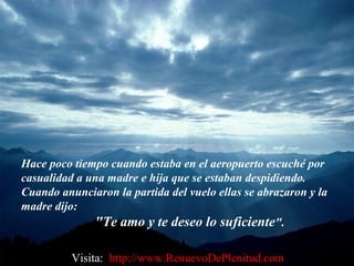 El documento describe el encuentro de una madre con una hija en el aeropuerto mientras se despedían. La madre le dijo a la hija "te deseo lo suficiente", refiriéndose a desearle una vida llena solo de las cosas suficientemente buenas. La madre explicó a una extraña en el aeropuerto que esa frase se ha transmitido generacionalmente en su familia y significa desear que alguien tenga suficiente de todo: sol, lluvia, felicidad, dolor, ganancias y pérdidas, para apreciar la vida.