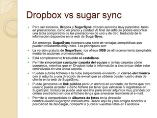 SugarSync es un servicio de almacenamiento en la nube similar a Dropbox que ofrece 5GB de espacio gratuito y permite sincronizar carpetas del equipo para acceder a archivos desde cualquier dispositivo. Algunas ventajas de SugarSync sobre Dropbox incluyen la capacidad de subir archivos por correo electrónico, generar enlaces públicos para archivos individuales, y compartir álbumes de fotos. SugarSync también está completamente traducido al español y permite sincronizar múltiples carpetas, a diferencia de Dropbox que requiere centralizar los