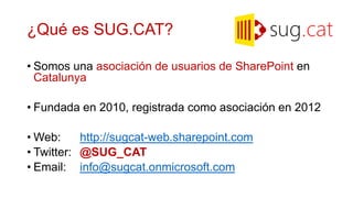 Sug.cat es una asociación de usuarios de SharePoint en Cataluña, fundada en 2010 y registrada en 2012, que organiza reuniones mensuales y eventos para fomentar la comunidad y el intercambio de conocimientos. Ofrecen ventajas para socios, como descuentos en libros y acceso exclusivo a material donado, y buscan convertirse en la comunidad técnica líder en SharePoint a nivel nacional y europeo. La asociación invita a la participación y retroalimentación, y está planificando futuros eventos relacionados con SharePoint.