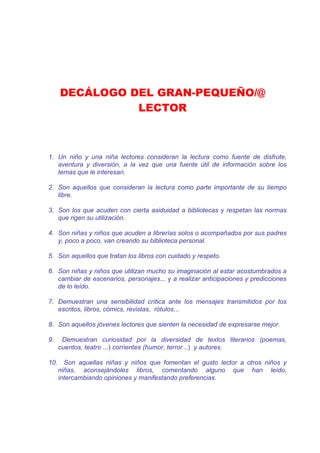 El documento presenta un decálogo de 10 puntos sobre las características de una familia comprometida con la lectura. Estas familias animan a sus hijos a leer desde pequeños, comparten cuentos y poesías con ellos, y les dan el ejemplo leyendo a diario. También respetan los gustos de lectura de sus hijos y los llevan a bibliotecas y librerías para fomentar su amor por los libros.