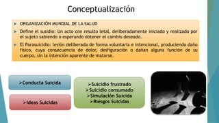 El documento habla sobre el suicidio en niños y adolescentes. Define el suicidio según la OMS y explica conceptos como conducta suicida, ideas suicidas, suicidio frustrado y consumado. Luego discute la etiología y factores de riesgo del suicidio como enfermedades mentales y acceso a métodos letales. Finalmente, resume técnicas psicoterapéuticas efectivas como la terapia cognitiva y terapia interpersonal para tratar síntomas depresivos y mejorar la autoestima en