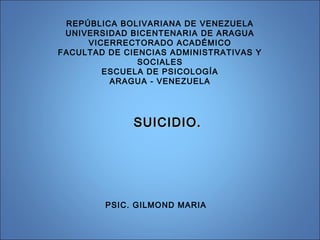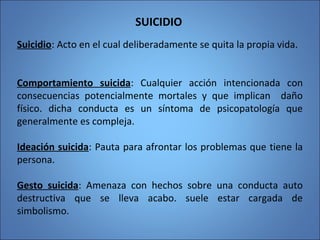 Este documento trata sobre el suicidio desde diferentes perspectivas. Brevemente describe el suicidio y comportamientos relacionados como la ideación o intentos suicidas. Explica factores de riesgo y etiología desde modelos genéticos, biológicos y sociales. Además, aborda la intervención terapéutica, aspectos a considerar en la entrevista con pacientes suicidas y la actitud terapéutica adecuada. Finalmente, incluye una cita sobre afrontar circunstancias adversas en la