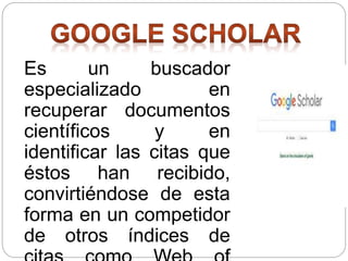 El documento presenta breves descripciones de diversos servicios de Google como Google Académico (buscador de documentos científicos), Google Earth (visualización de imágenes satelitales e información geográfica), Google Grupos (creación de grupos de interés), Google Libros (búsqueda de libros digitales), Google Calendar (agenda y calendario electrónico), Google Noticias (agregador de noticias), Google Sites (creación de sitios web), Google Hangouts (aplicación de mensajería) y Google Drive (almacenamiento en la
