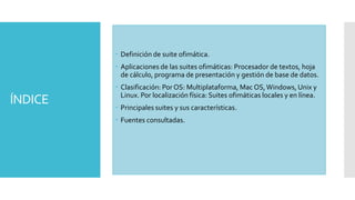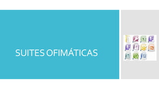 Este documento describe las suites ofimáticas, incluyendo su definición, aplicaciones principales como procesadores de texto y hojas de cálculo, y clasificación por sistema operativo y localización. Explica las suites más importantes como Microsoft Office, OpenOffice, LibreOffice e iWork y sus programas específicos.