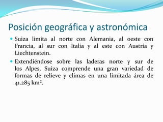 Suiza limita al norte con Alemania, al oeste con Francia, al sur con Italia y al este con Austria y Liechtenstein. Tiene una población de 7.7 millones de personas distribuidas en una variedad de climas y formas de relieve en su territorio de 41,285 km2. Los idiomas oficiales son el alemán, francés, italiano y romanche. La cultura suiza se ve influenciada por las culturas alemana, francesa e italiana y es conocida por sus bancos, chocolate, queso y relojes.