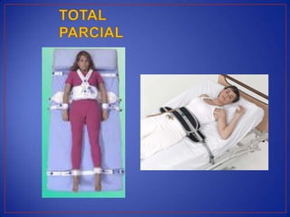 Este documento describe el uso de sistemas de inmovilización mecánicos en el tórax, muñecas y tobillos como último recurso para controlar conductas violentas que ponen en peligro al paciente o a otros. Las sujeciones deben aplicarse con seguridad y explicarse al paciente o familiares, manteniendo al paciente en posición anatómica correcta y revisando periódicamente su comodidad. La contención solo debe usarse de forma temporal hasta que el paciente esté bajo control.