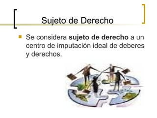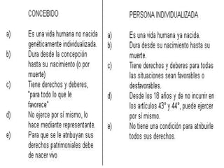 Este documento define y discute varios conceptos jurídicos clave relacionados con el inicio de la vida humana y la naturaleza de los sujetos de derecho. Define sujeto de derecho como un centro de imputación de deberes y derechos e identifica a las personas naturales y colectivas como sujetos. Explora teorías sobre el inicio de la vida, incluida la fecundación, concepción, anidación y actividad cerebral. También distingue entre ser humano, concebido y persona.