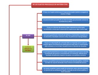 Este documento describe los diferentes sujetos procesales en materia civil en Venezuela. Explica que el juez es el director del proceso y debe garantizar el derecho de defensa de las partes de manera imparcial. Las partes principales son el actor o demandante y el demandado. También habla sobre otros sujetos como el secretario, alguacil, peritos, archivistas y terceros intervinientes. Define conceptos como legitimación, litisconsorcio y pluralidad de partes.