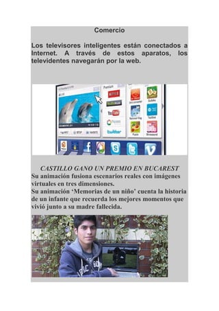 La tableta Sony S2 tiene dos pantallas de 5.5 pulgadas que se pueden usar juntas o separadas. Se describe una computadora todo terreno con componentes resistentes. Los televisores inteligentes están conectados a Internet para que los usuarios naveguen en la web. El animador Castillo ganó un premio en Bucarest por una animación que fusiona escenarios reales con imágenes 3D sobre los recuerdos de un niño de su madre fallecida.