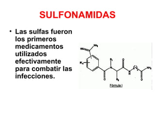 Este documento describe las sulfonamidas, incluido su descubrimiento, mecanismo de acción, espectro antibacteriano, farmacocinética, efectos adversos e indicaciones terapéuticas. Las sulfonamidas fueron los primeros medicamentos efectivos para combatir infecciones y siguen siendo útiles para tratar infecciones de las vías urinarias e infecciones respiratorias cuando se combinan con trimetoprima. Su mecanismo de acción implica bloquear la biosíntesis del ácido fólico bacteriano.