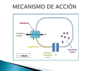 Las sulfonilureas son fármacos antidiabéticos que actúan estimulando la liberación de insulina endógena al unirse al receptor de la sulfonilurea en la célula beta pancreática. Mejoran la sensibilidad de los tejidos a la insulina de manera independiente. Existen sulfonilureas de primera y segunda generación que difieren en su afinidad por el receptor y su vida media. Su principal efecto adverso es la hipoglucemia.