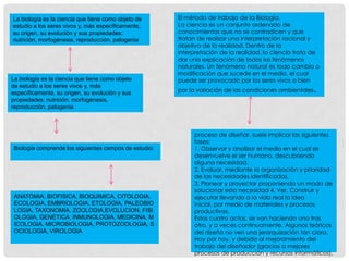 Este documento presenta un resumen de la biología como ciencia. Explica que la biología estudia los seres vivos, su origen, evolución y propiedades como la nutrición, morfogénesis y reproducción. Incluye los campos que comprende la biología como la anatomía, bioquímica, citología, ecología y más. También describe el método científico de trabajo en biología, enfocándose en observar fenómenos naturales, darles explicación y realizar interpretaciones objetivas de la realidad.
