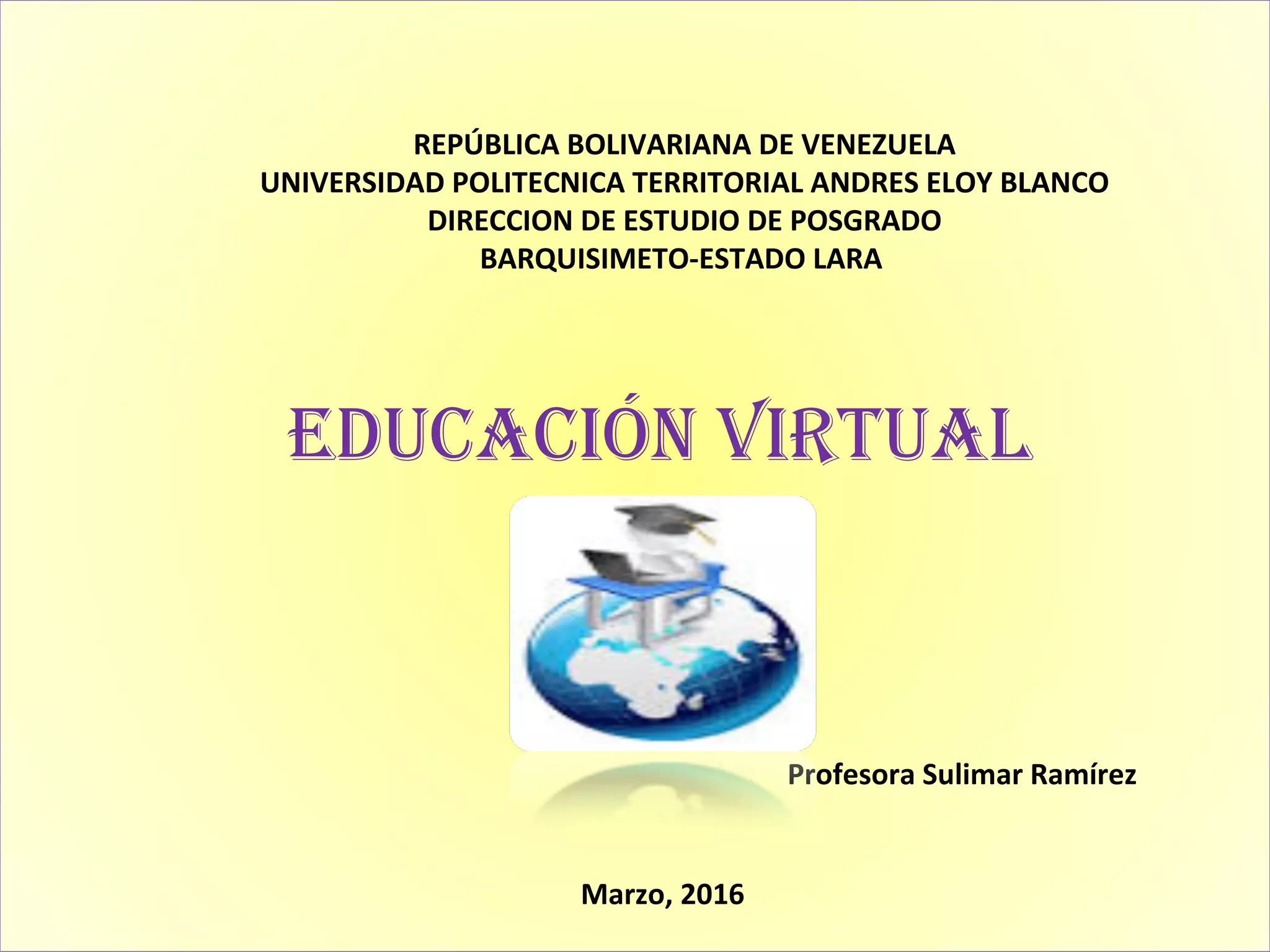 La educación virtual tiene desventajas como la falta de interacción cara a cara y el aislamiento de los estudiantes. También puede ser difícil motivar a los estudiantes sin la presencia física de un profesor.