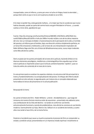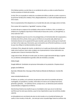 Tras la muerte de sus dos hijos, Chris Nielsen también fallece en un accidente. En el cielo, un ángel le explica que ha creado su propio paraíso basado en los sueños y recuerdos. Sin embargo, la esposa de Chris se suicida y va al infierno, por lo que él decide embarcarse en un peligroso viaje para rescatar su amor eterno.