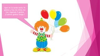 El payasito Regalito no sabe contar y necesita ayuda para sumar la cantidad de globos que tenía ayer (16 globos) y los que recibió hoy (5 globos) como regalo de los niños. El documento guía al lector paso a paso en realizar la suma de 16 + 5 para encontrar la cantidad total de globos que tiene Regalito.