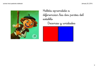 Este documento describe cómo unos niños ayudaron a unos pastores a contar sus ovejas usando el método de las decenas y unidades. Los niños aprendieron a diferenciar estas dos partes y a pasar ovejas de las unidades a las decenas cuando había más de 9 ovejas. Luego practicaron sumando cantidades representadas con decenas y unidades para determinar el número total de ovejas que tenían varios pastores juntos.