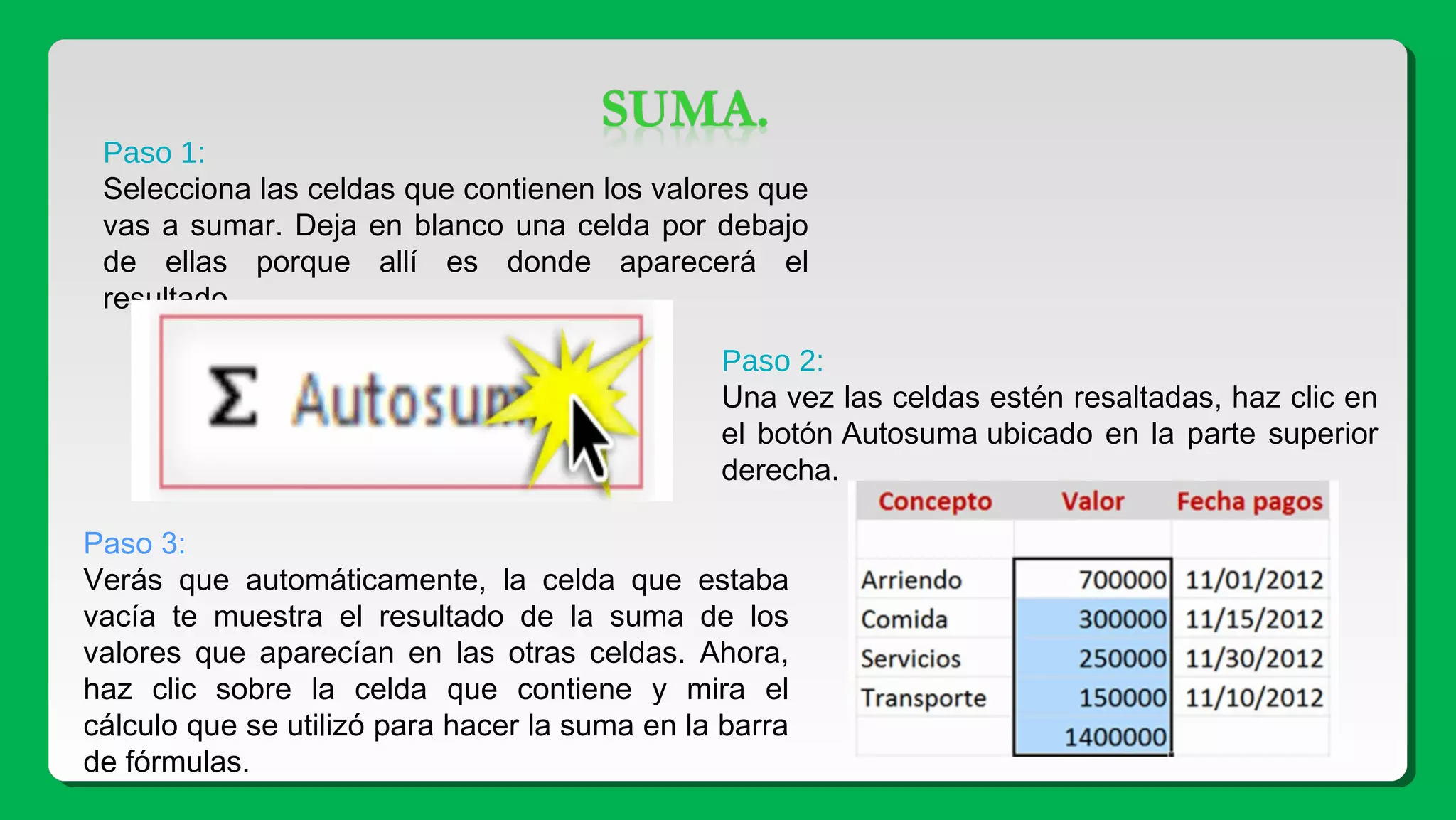 El documento explica cómo realizar operaciones básicas como sumar, restar y multiplicar en Excel utilizando celdas y fórmulas. Para sumar, se utilizan las celdas seleccionadas y se aplica la función de autosuma, mientras que para restar y multiplicar se ingresan fórmulas específicas con referencias a otras celdas. Se destaca que al modificar los valores en las celdas de referencia, los resultados se actualizarán automáticamente sin necesidad de cambiar las fórmulas.