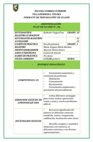 El documento presenta un formato de preparación de clases para una estudiante maestra. El plan de clase incluye objetivos, actividades y materiales para una lección sobre sumas sin llevar en grado primero. La lección se divide en tres momentos: introducción, desarrollo y evaluación, y utiliza ejercicios prácticos y lúdicos para enseñar a los estudiantes a resolver problemas de suma.