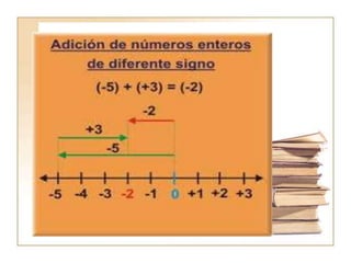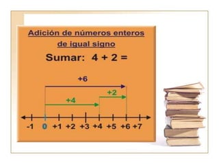 El documento describe las operaciones básicas de adición y sustracción con números enteros. Explica cómo representar números enteros en una recta numérica, define conceptos como números opuestos y valor absoluto, y describe los algoritmos para sumar y restar números enteros, incluyendo ejemplos. También cubre las propiedades de la adición como conmutativa y asociativa, así como el elemento neutro de la suma.
