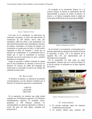 Este documento describe el diseño e implementación de un circuito que suma dos números de ocho bits utilizando dos sumadores integrados de cuatro bits en paralelo. El circuito conecta los sumadores a través de las salidas y entradas de acarreo para transferir cualquier unidad resultante de la suma. Al probar el circuito, los LEDs se iluminaron correctamente para mostrar el resultado de la suma de dos números de ejemplo.