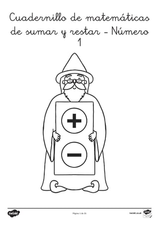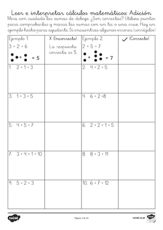 Este documento contiene varias páginas de ejercicios de matemáticas sobre sumas y restas para niños. Incluye hojas de trabajo con ejercicios de completar sumas y restas, identificar si sumas son correctas o no, realizar cálculos utilizando rectas numéricas, y colorear dibujos según las respuestas de sumas y restas. El objetivo es que los niños practiquen conceptos básicos de adición y sustracción hasta el número 20.