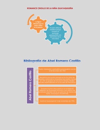 El poema utiliza la metáfora para comparar a una niña guayaquileña con elementos de la naturaleza como palomas, frutas y árboles. Cada estrofa tiene 8 sílabas y emplea figuras literarias como la sinalefa, diéresis y agudos para mantener la métrica. El autor, Abel Romero Castillo, fue un poeta, historiador y periodista guayaquileño nacido en 1904.