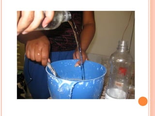 El documento habla sobre el origen del término "shampoo" y su introducción en Gran Bretaña por Sake Dean Mahomed en 1759. Explica que los peluqueros ingleses hervían jabón en agua con hierbas aromáticas para dar brillo y fragancia al pelo. Luego proporciona una lista de materiales e ingredientes para hacer shampoo y los costos asociados con producir y vender 400 ml de un producto llamado "Summer Protect".