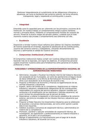 La SUNAT es la entidad encargada de administrar, fiscalizar y recaudar los principales tributos en el Perú como el IGV, Impuesto a la Renta e Impuestos Selectivos. También se encarga de regular el comercio exterior aplicando derechos arancelarios a las importaciones. Está conformada por órganos de línea que fiscalizan tributos internos y aduaneros a nivel nacional y regional.