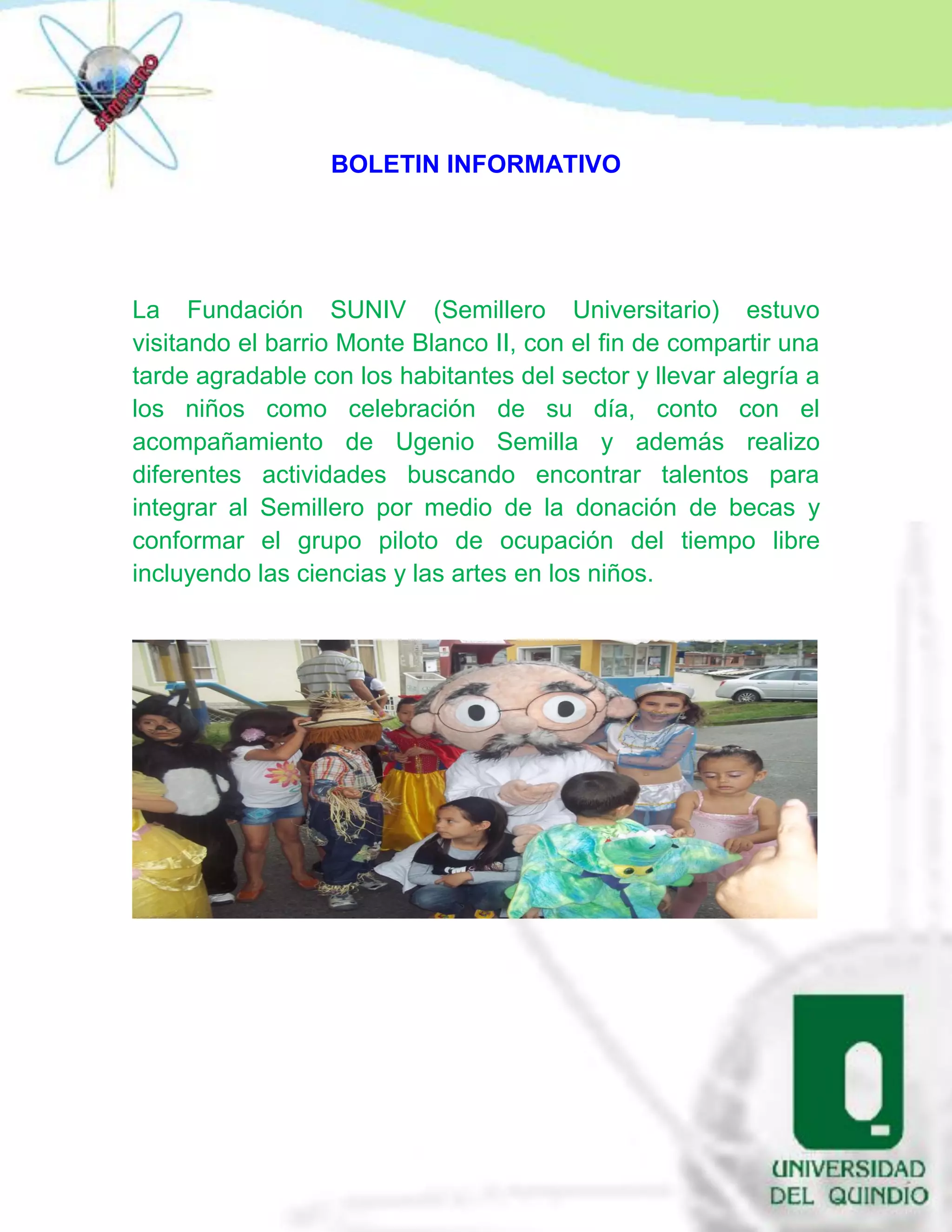 La Fundación SUNIV visitó el barrio Monte Blanco II para compartir una tarde agradable con los habitantes del sector y celebrar el día de los niños. Realizaron diferentes actividades con el comediante Ugenio Semilla para encontrar talentos en los niños e integrarlos al Semillero Universitario a través de becas. El objetivo también era conformar un grupo piloto para ocupar el tiempo libre de los niños con ciencias y artes.