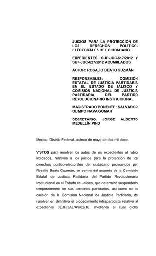 El documento trata sobre los juicios para la protección de los derechos político-electorales promovidos por Rosalío Beato Guzmán contra la suspensión temporal de sus derechos partidarios por parte de la comisión estatal de justicia partidaria del PRI en Jalisco. Se detallan los antecedentes del caso, las acciones tomadas por Guzmán, y se analiza la competencia del tribunal para resolver la controversia en torno a su suspensión. Asimismo, se establece que los juicios fueron presentados de manera oportuna y que se acumulan dos expedientes para su resolución conjunta debido a su conexidad.