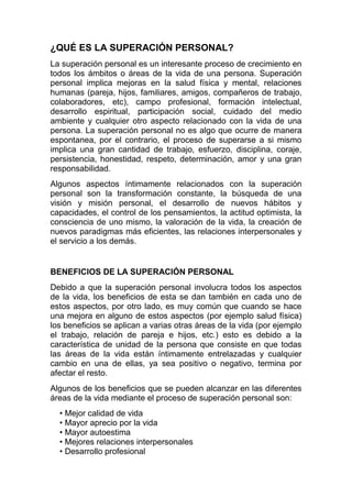 La superación personal es un proceso de crecimiento que abarca diversas áreas de la vida de una persona, incluyendo la salud, relaciones y desarrollo espiritual, y requiere trabajo, disciplina y determinación. Los beneficios de la superación personal se reflejan en mejoras significativas en la calidad de vida, autoestima y relaciones interpersonales, mientras que los obstáculos suelen provenir de la propia persona, como el miedo y la baja autoestima. Para lograr la superación personal, es fundamental realizar cambios en los pensamientos, establecer metas y mantener un esfuerzo constante en diversas áreas de la vida.
