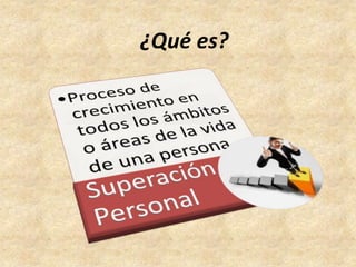 Este documento presenta los conceptos de superación personal, pensamiento crítico y creativo. Explora qué es la superación personal, cómo ocurre y los aspectos relacionados con ella. También analiza los beneficios y obstáculos de lograr la superación personal, y ofrece pasos para alcanzarla, incluyendo el aprendizaje continuo y desarrollo personal.