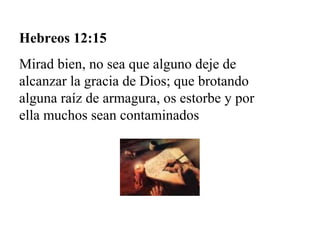 El documento aborda la raíz de amargura, explicando cómo el rencor puede crecer en una persona debido a injusticias reales o imaginarias, afectando sus relaciones y su conexión con Dios. Se presentan ejemplos bíblicos, como el de Caín y Abel, y se ofrecen soluciones para superar esta amargura, incluyendo el perdón y la reconciliación. Además, se enfatiza la importancia de la comunicación y la seguridad emocional en las relaciones para prevenir el resentimiento.