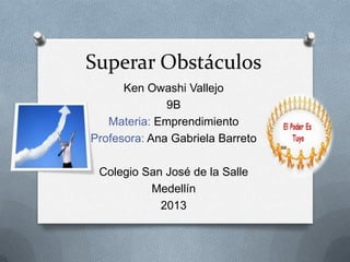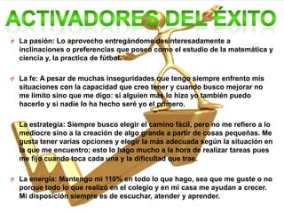 El documento describe cuatro estrategias que el autor utiliza para superar obstáculos: 1) la pasión, entregándose desinteresadamente a sus inclinaciones; 2) la fe, enfrentando situaciones con la capacidad que cree tener; 3) la estrategia, eligiendo el camino más adecuado según la situación; y 4) la energía, manteniendo el 110% en todo lo que hace. También analiza por qué es difícil superar la frustración y los beneficios de lograrlo.