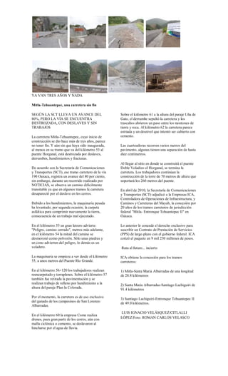 El proyecto de ampliación de la carretera Oaxaca-Puerto Escondido-Huatulco en México ha registrado un retraso significativo, completando solo el 18.56% de los 37.7 km previstos para este año. Según los informes, solo se han terminado 7 km de la carretera, a pesar de una inversión de 492.2 millones de pesos. Asimismo, la carretera Mitla-Tehuantepec, aunque se inició su construcción hace más de tres años, sigue sin terminarse y su tramo entre el km