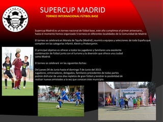 Este documento proporciona información sobre el torneo de fútbol base SuperCup Madrid que se celebrará del 4 al 7 de junio de 2015 en Morata de Tajuña, Madrid. El torneo contará con categorías infantiles, alevines y prebenjamines de equipos de toda España y se jugará en campos de césped artificial.