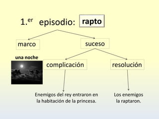 El documento describe la estructura narrativa de un cuento dividido en episodios. El primer episodio narra el rapto de la princesa por enemigos del rey en su habitación. En el segundo episodio, la princesa logra huir después de que sus captores la liberan. En el tercer episodio, la princesa pide ayuda tocando la flauta y el hada crea un lago para detener a sus perseguidores. Finalmente, en el cuarto episodio los captores caen en el lago y la princesa vuelve a huir.